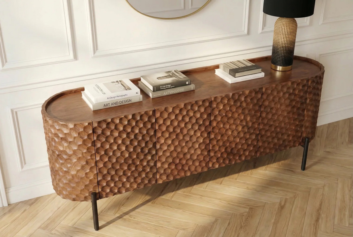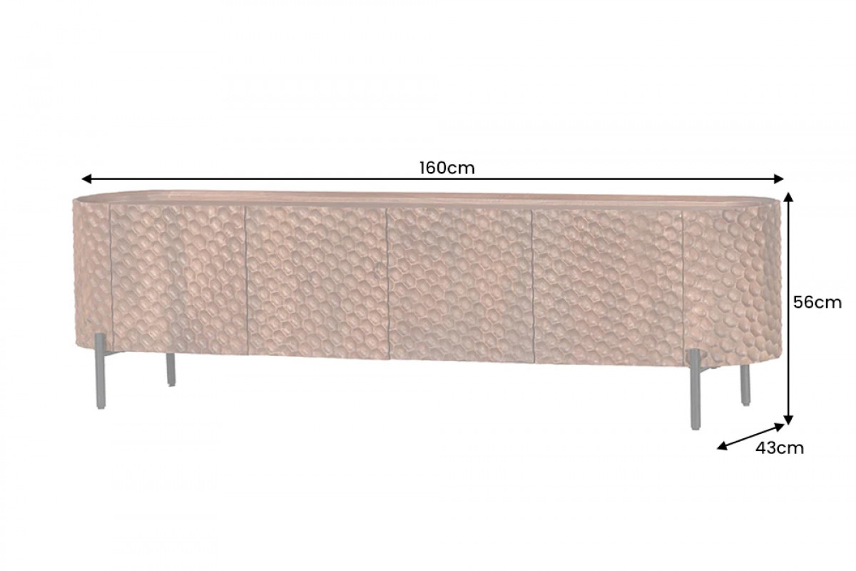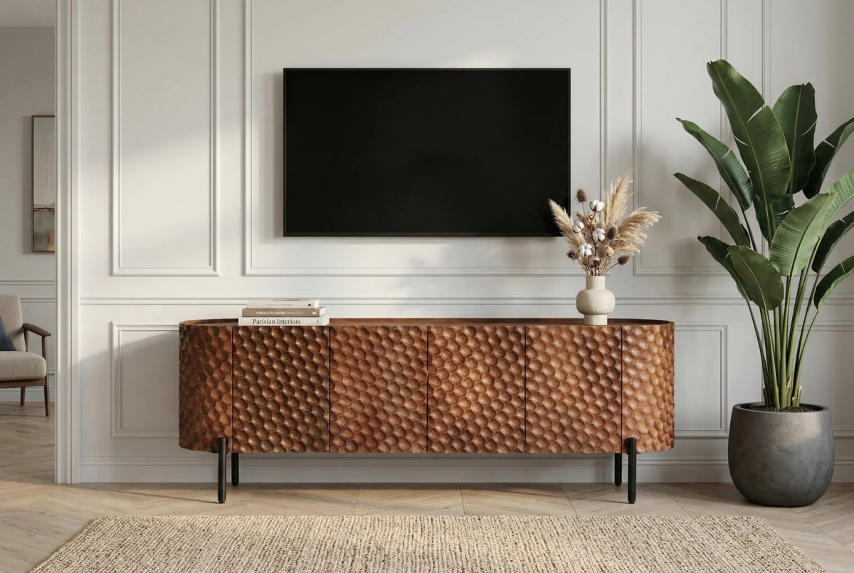 Az ADLON TV-szekrény a természetes melegség és a modern karakter találkozása. A korpusz masszív mangófa, mely gazdag erezetével és natúr tónusaival meleg, élő érzést ad minden térnek. A front és oldalsó elemek lenyűgöző 3D-méhsejt struktúrával díszítettek, amely plasztikus játékot visz a bútor felületébe — fény és árnyék válik részesévé a látványnak