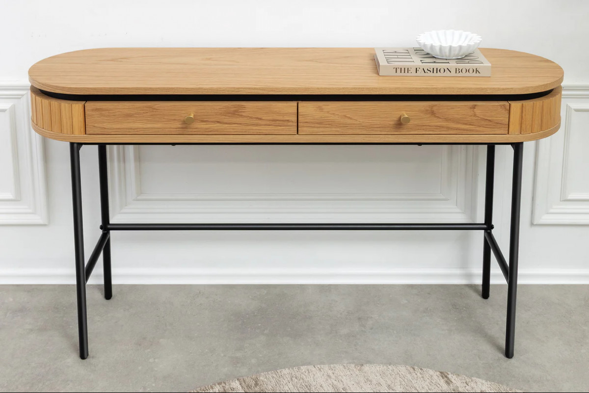Az ATELIER konzolsztal a modern letisztultság és a skandináv elegancia mesterműve. A természetes tölgy furnér meleg tónusa nyugalmat sugároz, míg a  fekete színű fém lábak dinamikus kontrasztot adnak, amely karaktert visz az enteriőrbe. A bútor különlegességét a lekerekített sarkok lágy vonalai, az oldalsó felületeken megjelenő elegáns bordázottság és az asztallap alatt végigfutó fekete szegély adják, amelyek kifinomult kontrasztot teremtenek. Mindez harmonikus, modern összhatást eredményez, amely egyszerre stílusos és időtálló megoldás.
