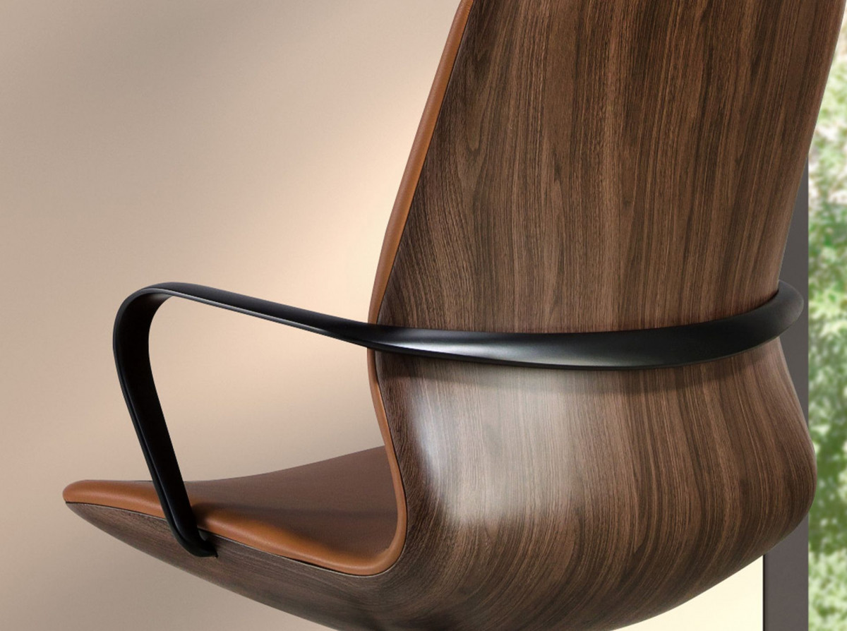A CORDERO forgószék egy modern, spanyol inspirációjú irodai forgószék, amely a kortárs formatervezés és a mindennapi funkcionalitás harmonikus egyensúlyát hozza el. A barna szintetikus bőr kárpit kifinomult megjelenést és tartós használatot biztosít, miközben a hátul összefonódó karfák letisztult, egységes sziluettet rajzolnak. A hajlított fa háttámla természetes eleganciát ad a széknek, hangsúlyozva a gondosan megtervezett, karakteres formavilágot.