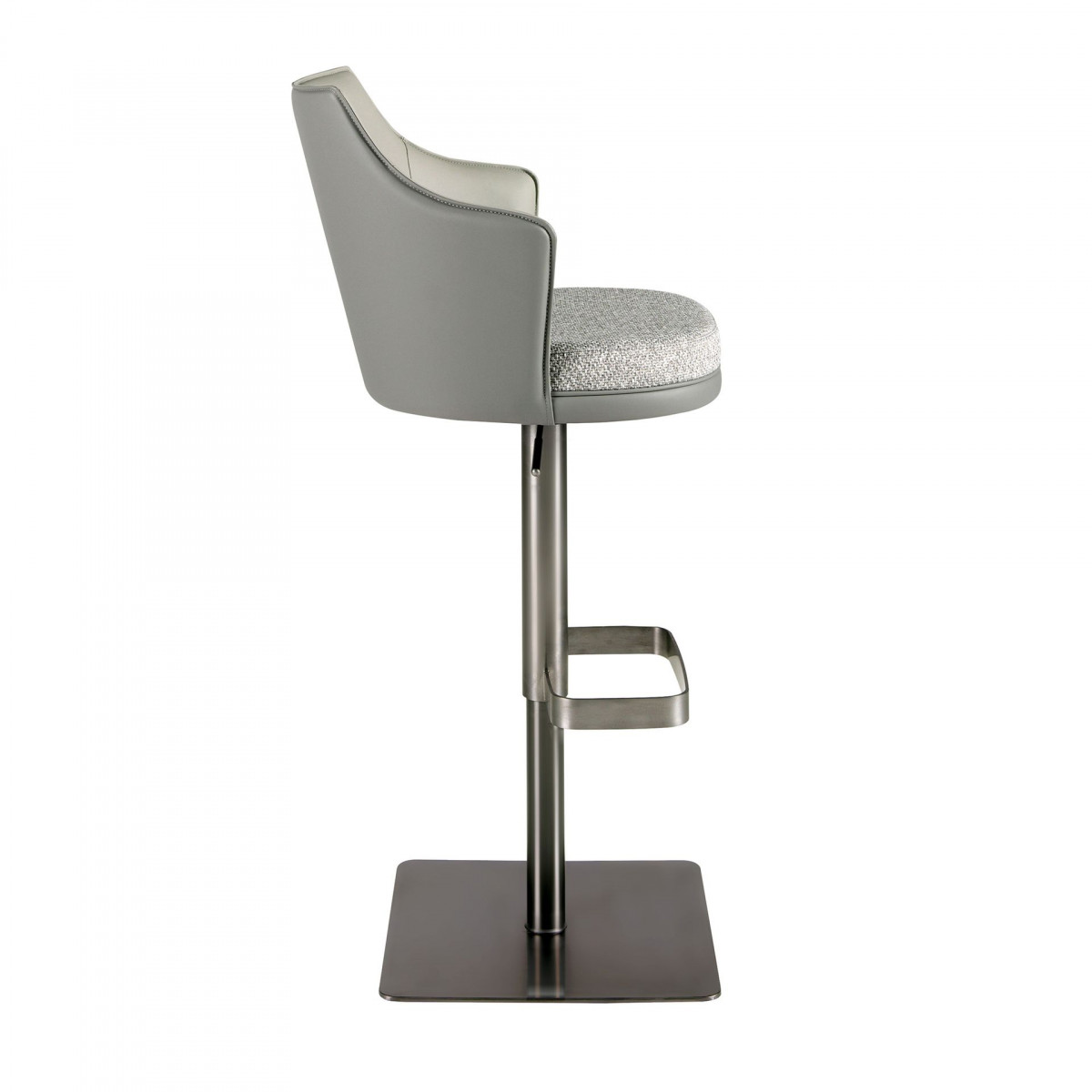 A GAUDI bárszék a kortárs spanyol design kifinomultságát és a funkcionalitás eleganciáját ötvözi. Az ülőfelületet világosszürke szövet borítja, míg a háttámla szürke bőrhatású kárpitozása karakteres kontrasztot teremt, így a szék egyszerre meleg, mégis határozott megjelenésű.