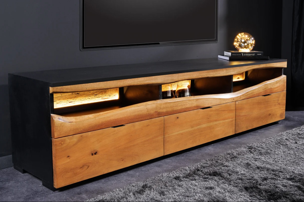 A beépített LED-hangulatvilágítás finom, indirekt fényt biztosít, amely kiemeli a fa struktúráját, és különleges atmoszférát teremt a térben. A szekrény kialakítása nemcsak látványos, hanem praktikus is: a tágas fiókok és nyitott rekeszek elegendő helyet kínálnak a médiakészülékek és kiegészítők számára, míg a hátoldali kábelkivezetések segítenek a rendezett elrendezésben.