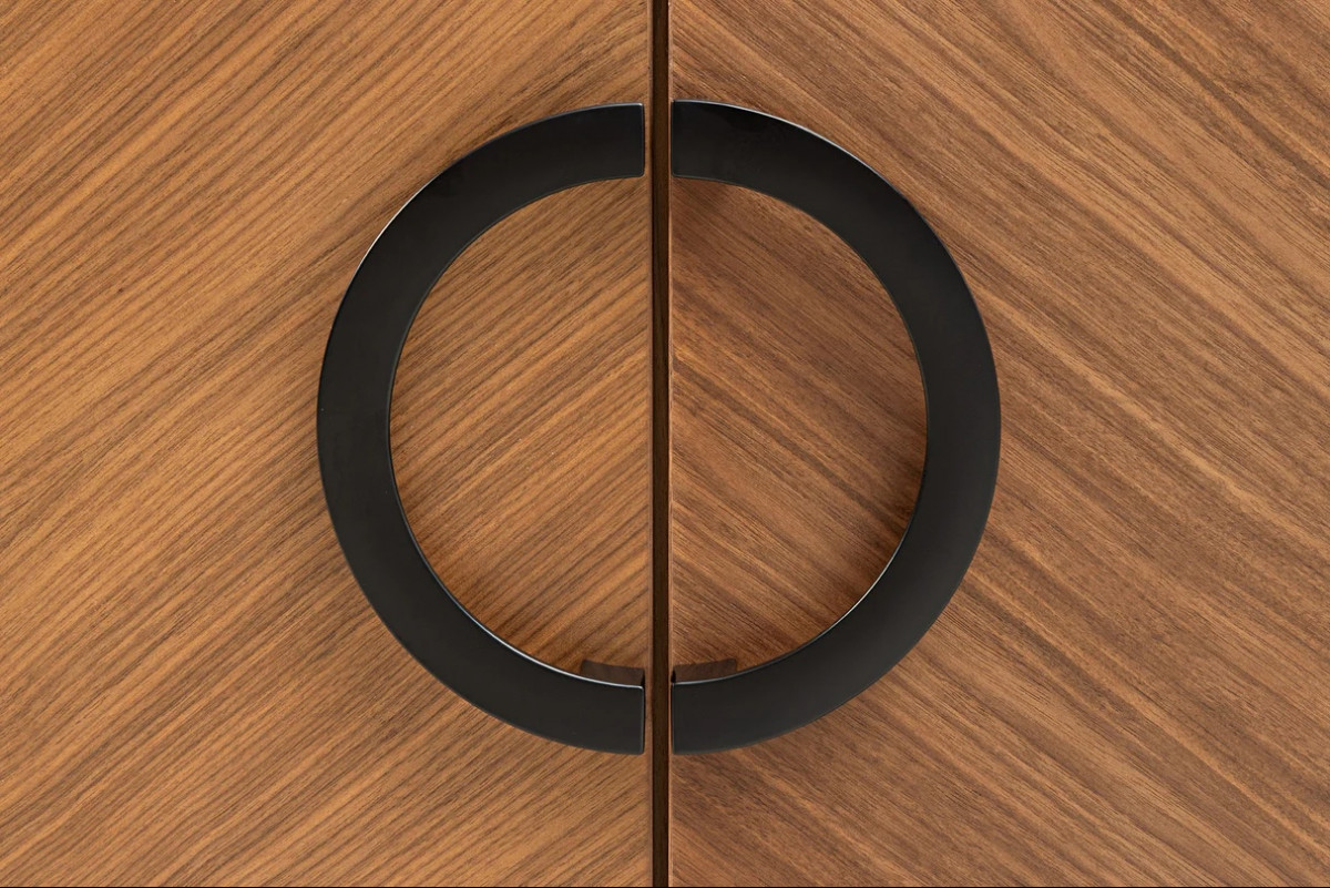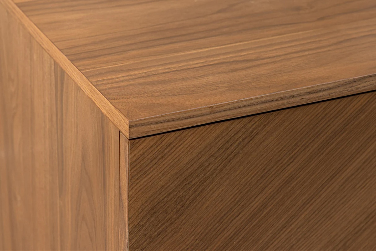 A GRANDEZZA komód a természetes elegancia és a modern ipari stílus tökéletes egyensúlyát teremti meg. A bútor felületét finom diófa furnér borítja, amelynek meleg tónusai és gazdag erezete különleges látványt nyújt. A letisztult vonalvezetés és a precízen illesztett faelemek időtlen harmóniát sugároznak. A fekete fém lábak elegáns kontrasztot alkotnak a diófa természetes árnyalataival, vizuálisan könnyeddé téve a kompozíciót.