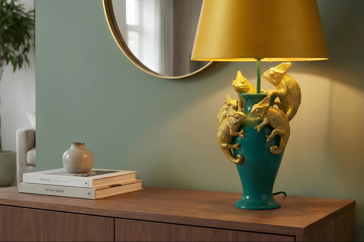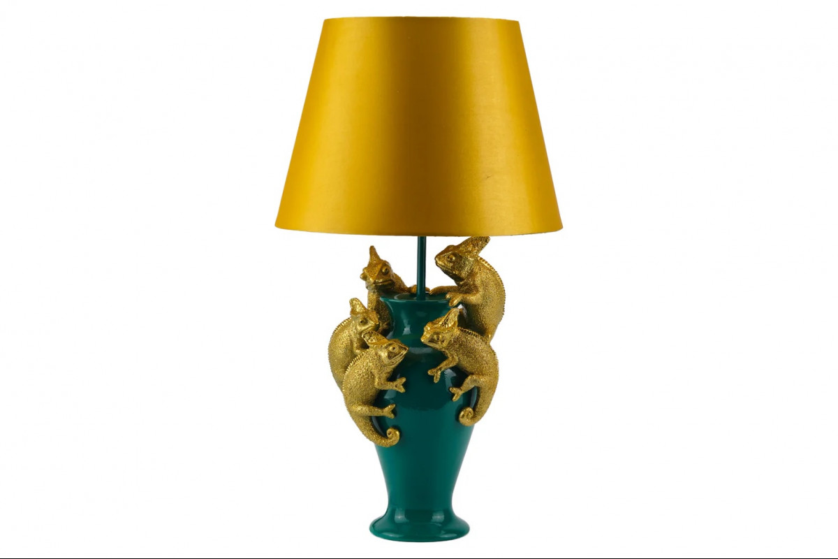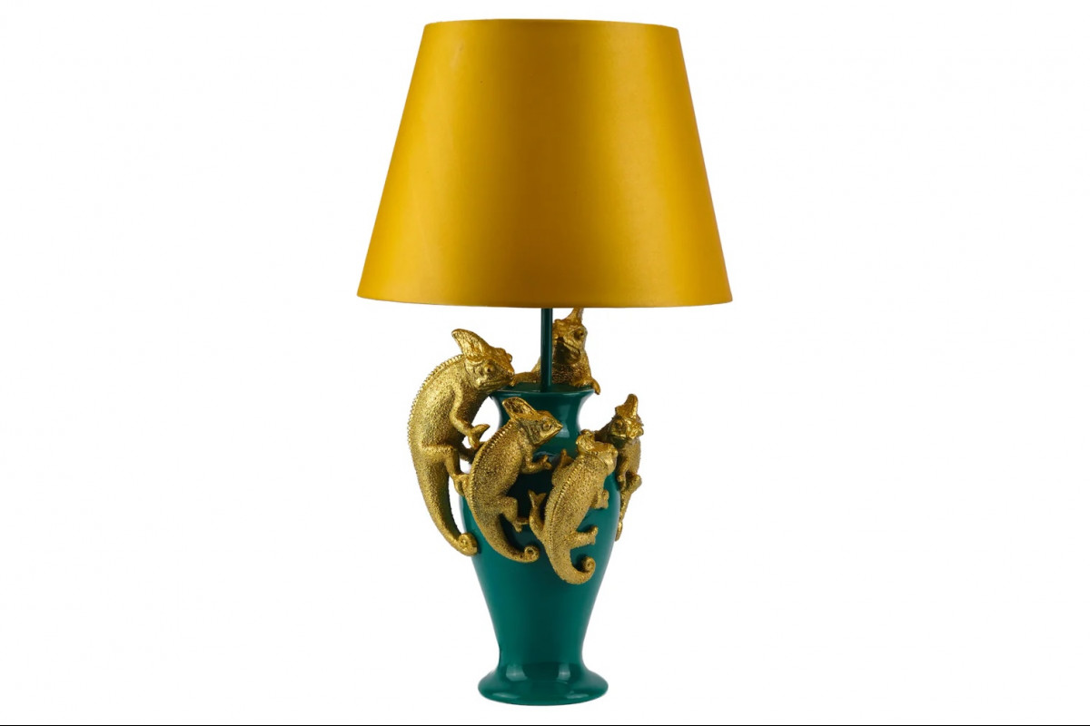 A KAMELEON asztali lámpa igazán különleges látványt nyújt. Az elegáns zöld lámpát játékossá teszik az arany színű kaméleonok és a citromsárga színű lámpaernyő. Extravagáns dísze lehet bármely helyiségnek.