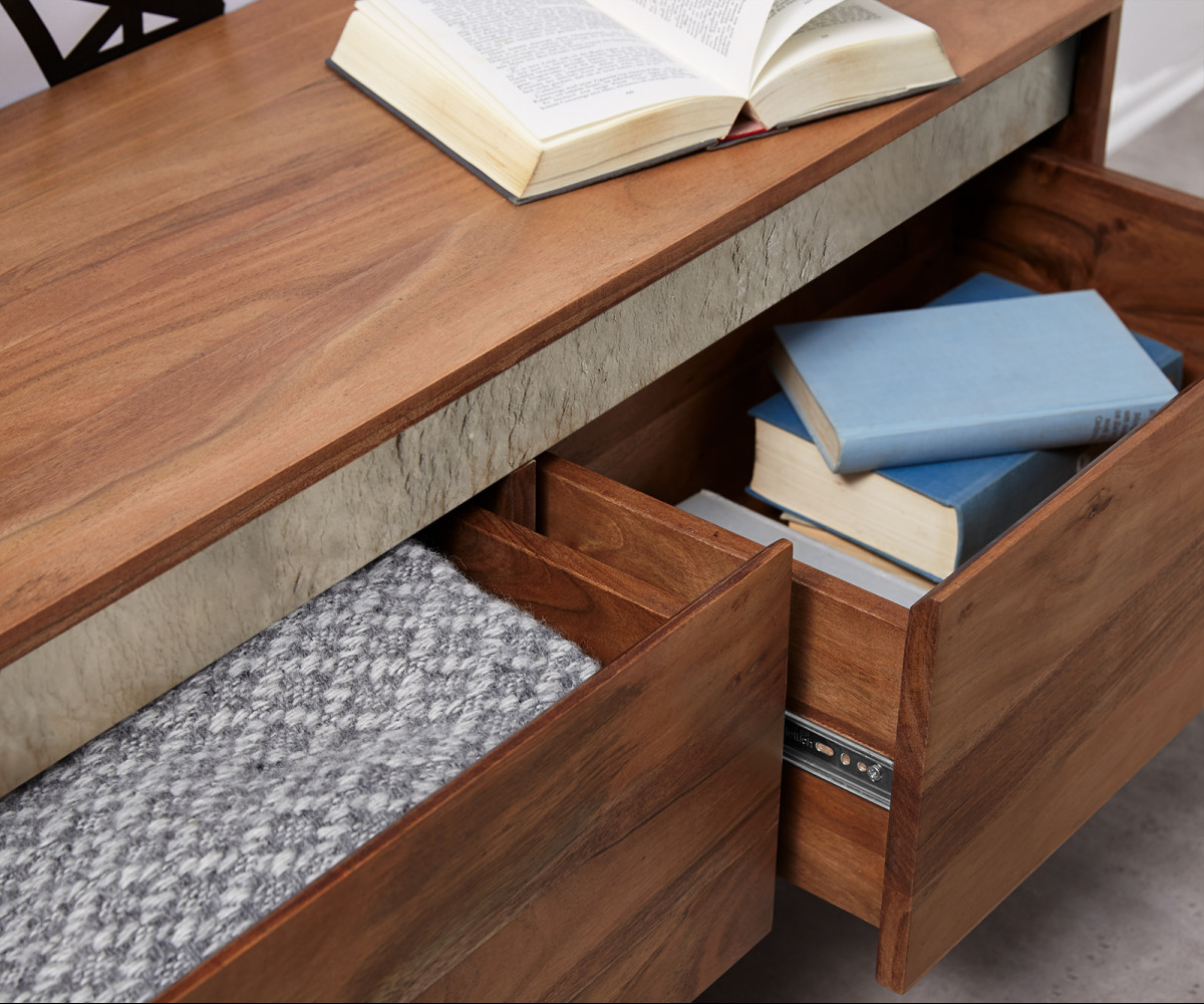 A KIPLING TV-szekrény lenyűgöző bútordarab. A csodás mintázatú akácfából készült komód letisztult, minimalista frontját világos kőfurnér szegélyezi, megtörve ezáltal a monotonitást. A bútort látványos V-alakú porfestett fekete fém lábak támasztják alá.
