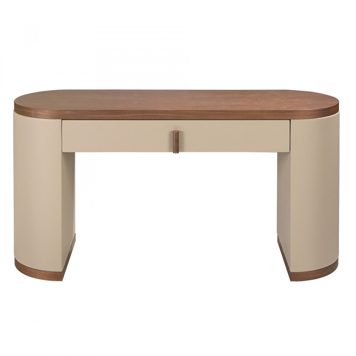 A LAVIDA konzolasztal a spanyol formatervezés és a funkcionális elegancia tökéletes egyensúlyát hozza el a hálószobába vagy gardróbba. A beige színű szintetikus kárpitozott felülete finoman meleg tónust ad a bútorfrontoknak, miközben a diófa részletek természetes karaktert visznek a térbe.