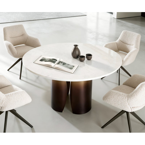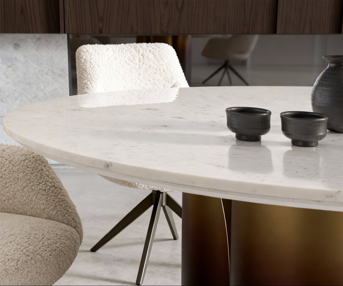 A LUCENTE étkezőasztal a modern elegancia egyik legszebb példája. A márvány asztallap finom erezetével és természetes fényjátékával azonnal luxusérzetet teremt. A kecsesen metszett fém lábak könnyed geometriája modern karaktert visz a bútorba, miközben stabil alapot ad. A kő és a fém kontrasztja időtlenül hat elegánsnak, a letisztult arányok pedig bármilyen enteriőrben kiemelik az asztal kifinomult jelenlétét.