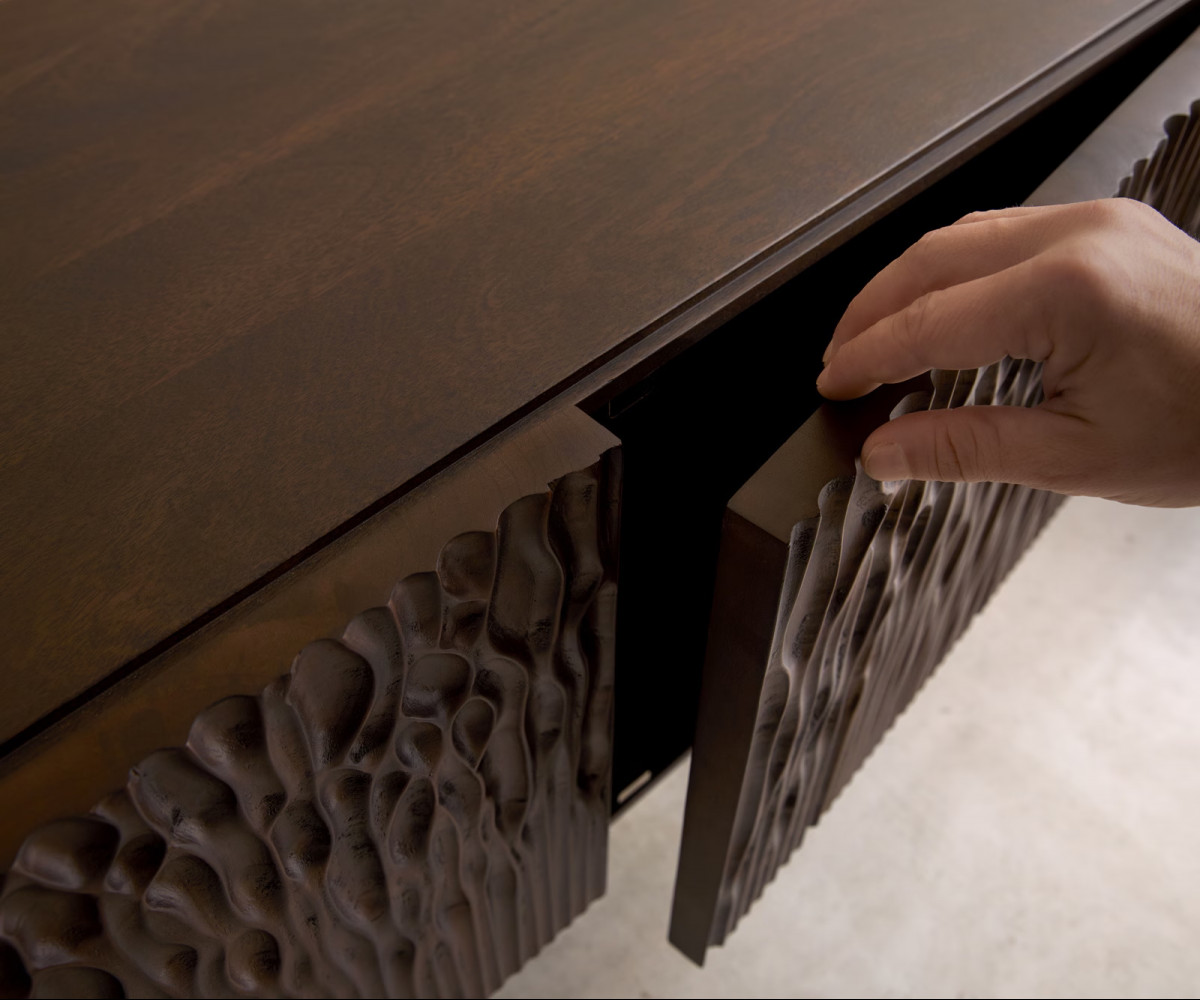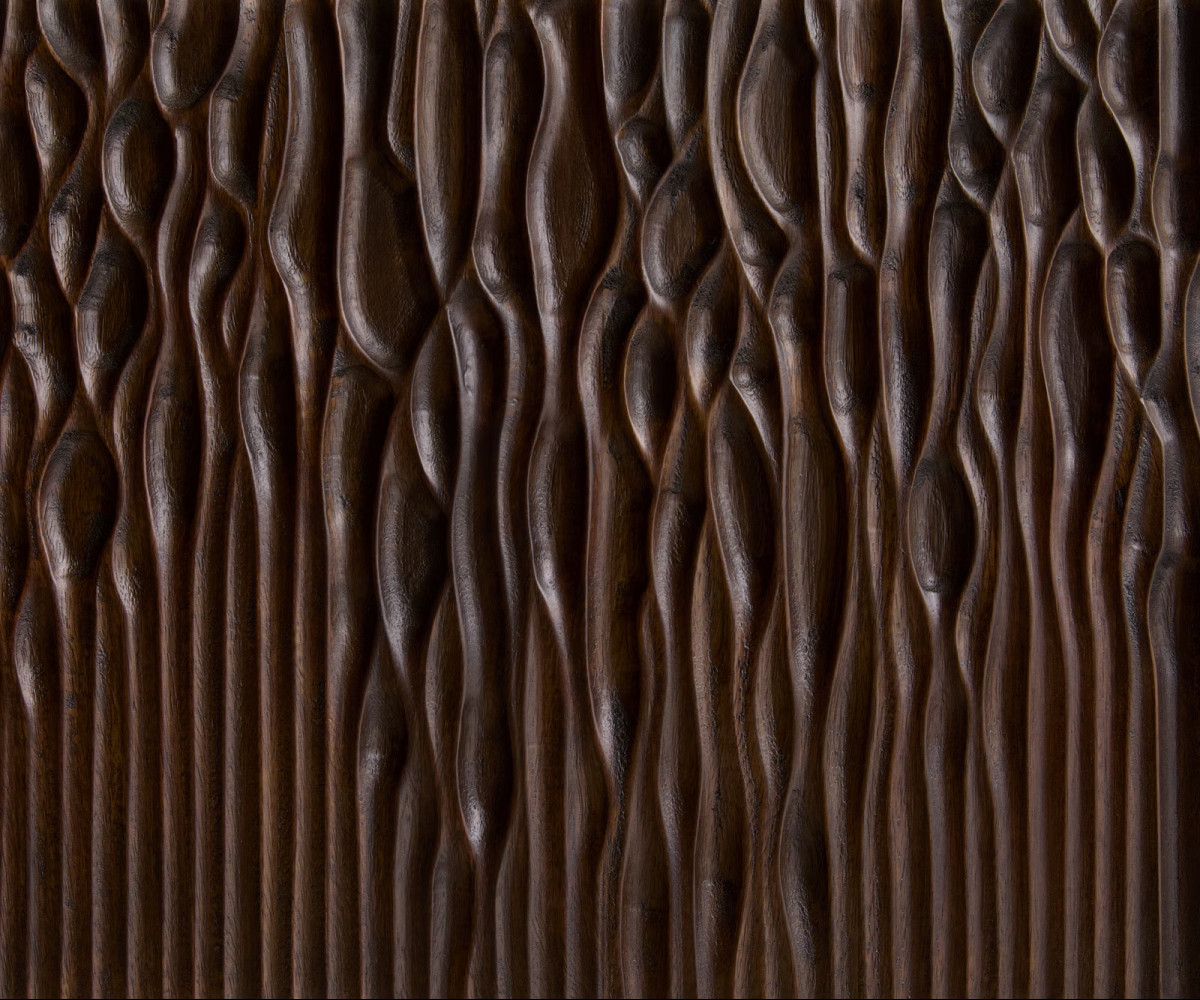 A MARENO TV-szekrény a természetes elegancia és a modern minimalizmus találkozása. A sötétebb tónusú tömör mangófa gazdag erezete és finoman strukturált felülete meleg, exkluzív karaktert ad a bútornak. A front mintázata lágy ritmusban vezeti a tekintetet, finom fény-árnyék játéka pedig különleges mélységet kölcsönöz a megjelenésnek.