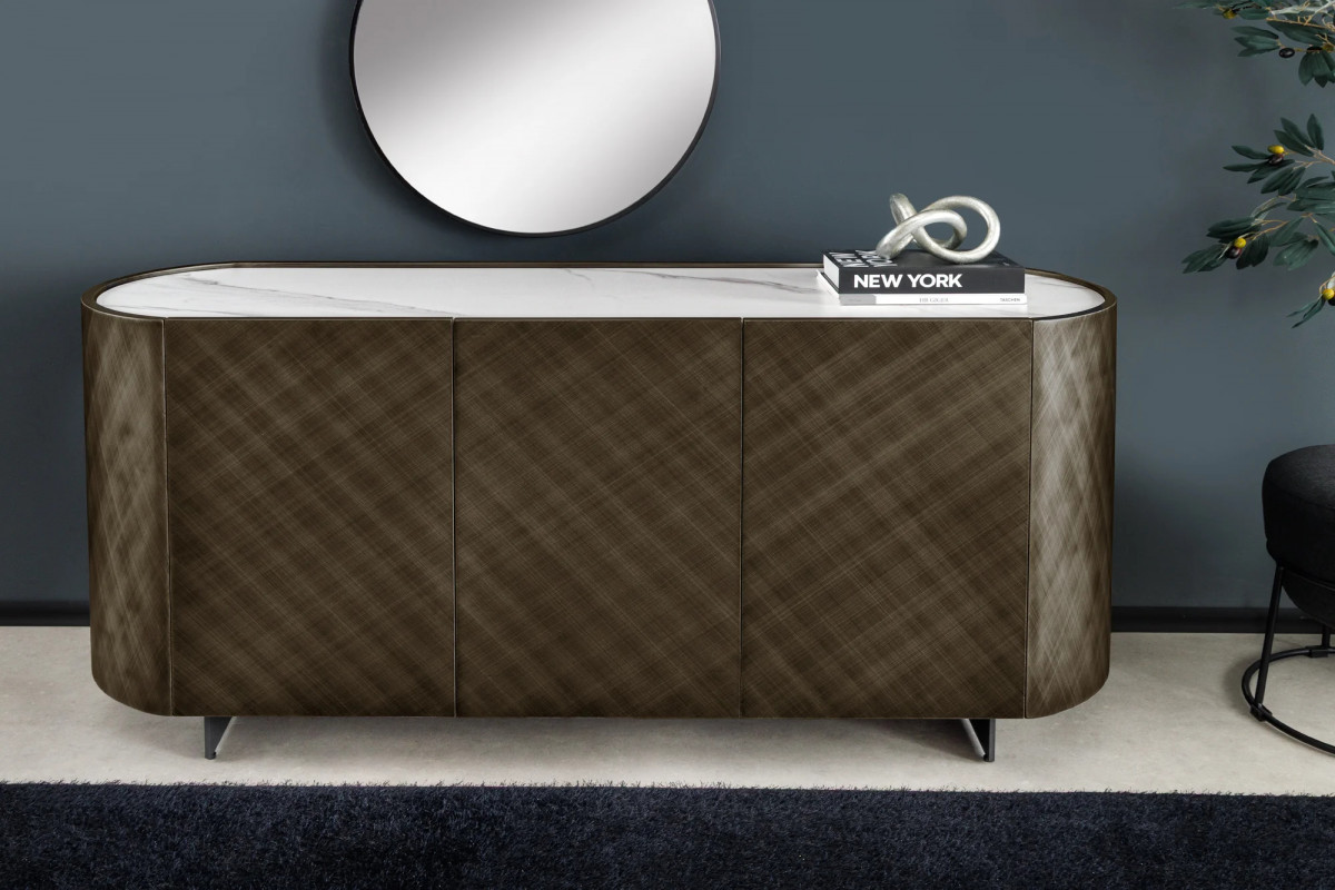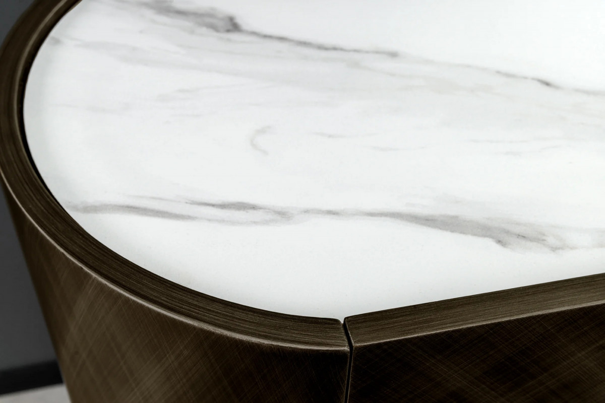 A REFLECTION komód modern és stílusos. A finoman lekerekített forma elegáns és harmonikus megjelenést kölcsönöz. A különleges technológiával készített szálcsiszolt, bronz hatású felület teszi igazán látványossá a bútordarabot, melyre a koronát a márvány mintázatú kerámia fedlap helyezi fel.
