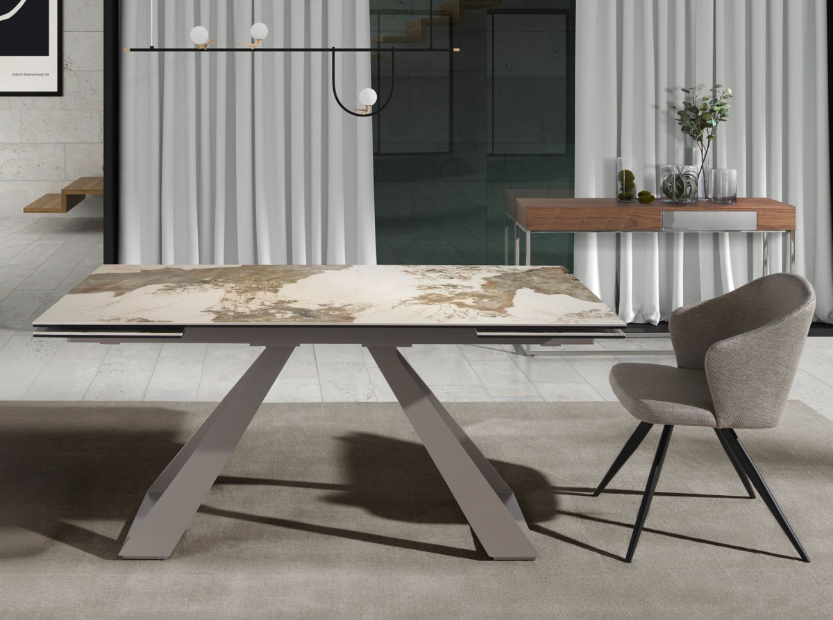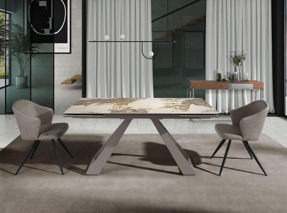 A SENORA prémium spanyol tervezésű étkezőasztal, amelynek világos porcelán márványlapját finom, természetes erezet díszíti, elegáns és nyugodt színvilágot teremtve az étkezőben. A taupe szürke acél lábak modern kontrasztot adnak a letisztult felülethez.