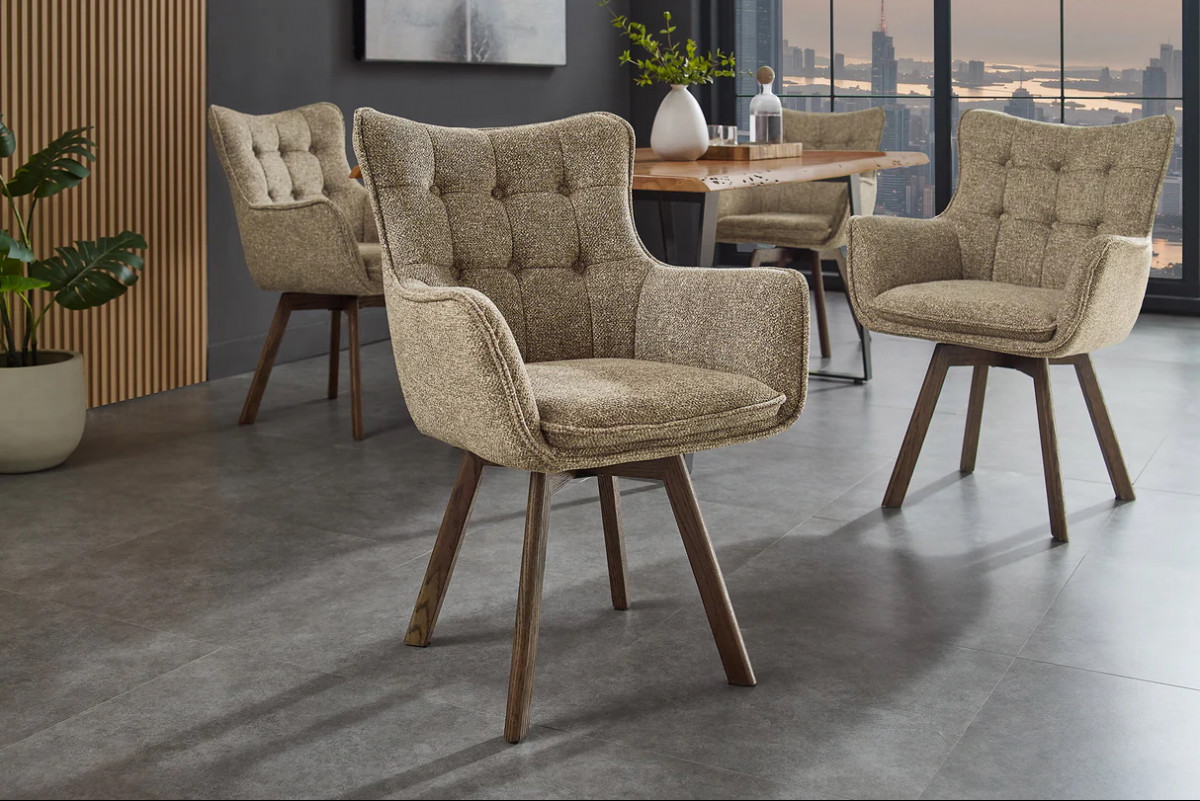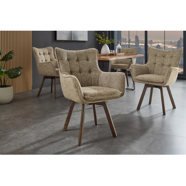 Az THOR szék a stílusos otthon egyik legkomfortosabb központi darabja. A finoman texturált szövetborítás meleg, meghitt hangulatot teremt, míg a tölgyfa keret természetes karakterrel ruházza fel a bútort.
