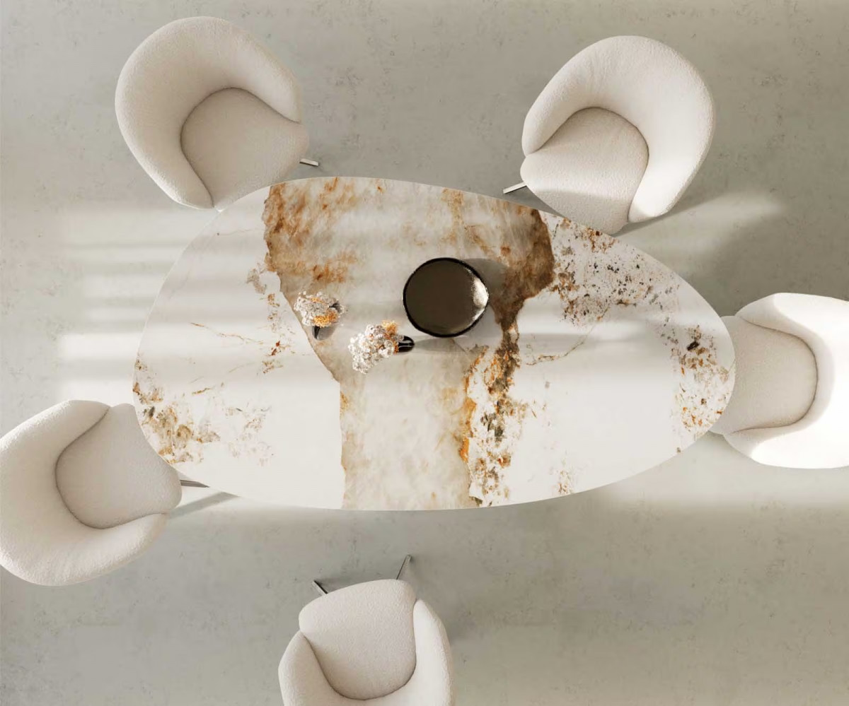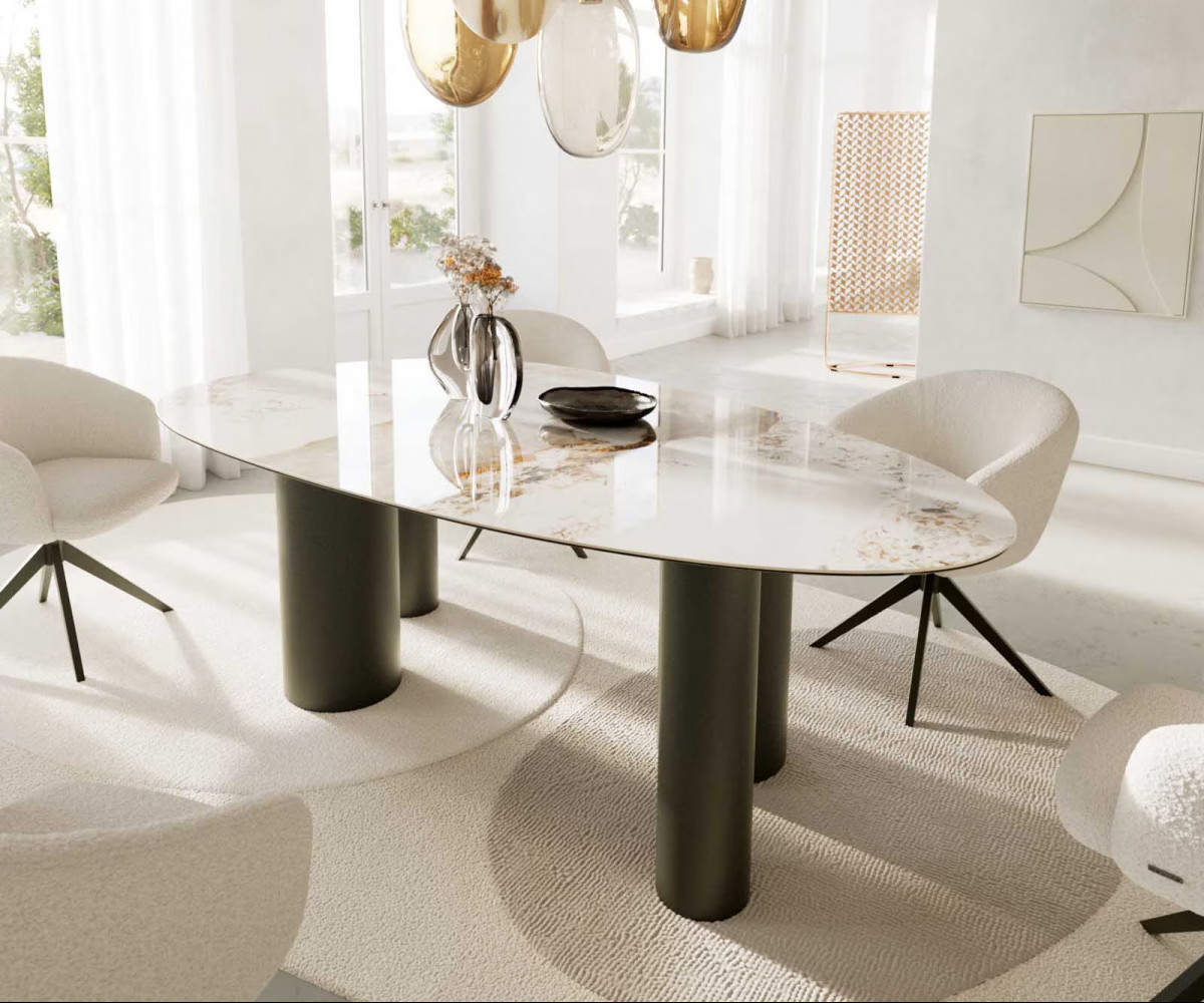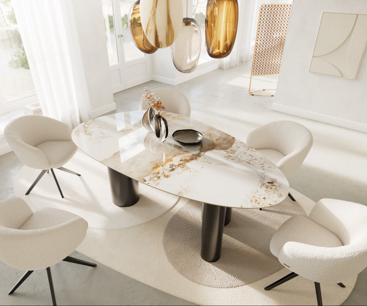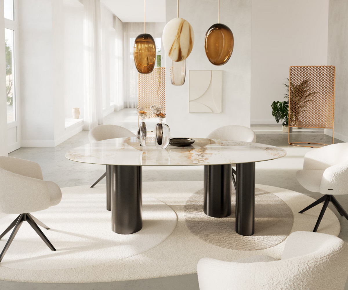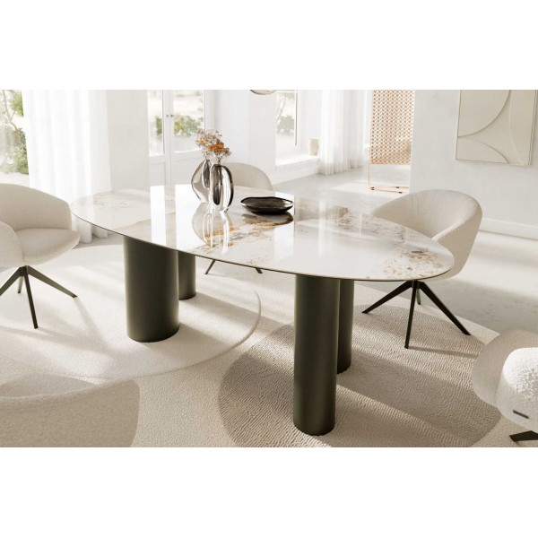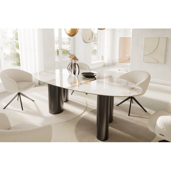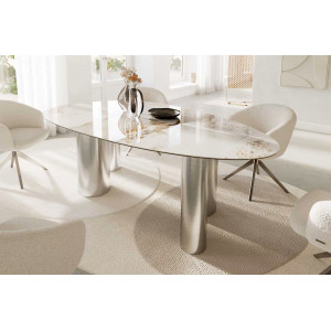 A VERANO étkezőasztal egy valódi kortárs műremek. Az ovális kerámia asztallapban örvénylő pasztell színek varázslatos látványt nyújtanak, az asztal textúrája lágyan simogatja érzékeit. A magas minőségű kerámialap biztonsági üveg hordozórétegen foglal helyet, a nagy ellenállóképességű asztallap folt és karcálló, könnyen ápolható. Az egyedien elrendezett fém lábak minimalista megjelenése rendkívül nagy stabilitással párosul. Páratlan dísze lehet egy kifinomult étkezőnek.
