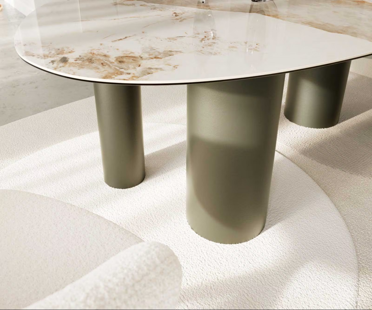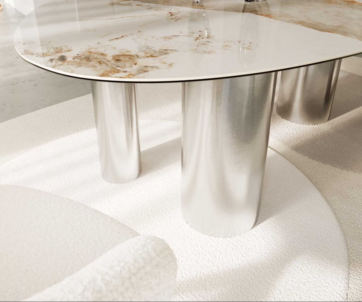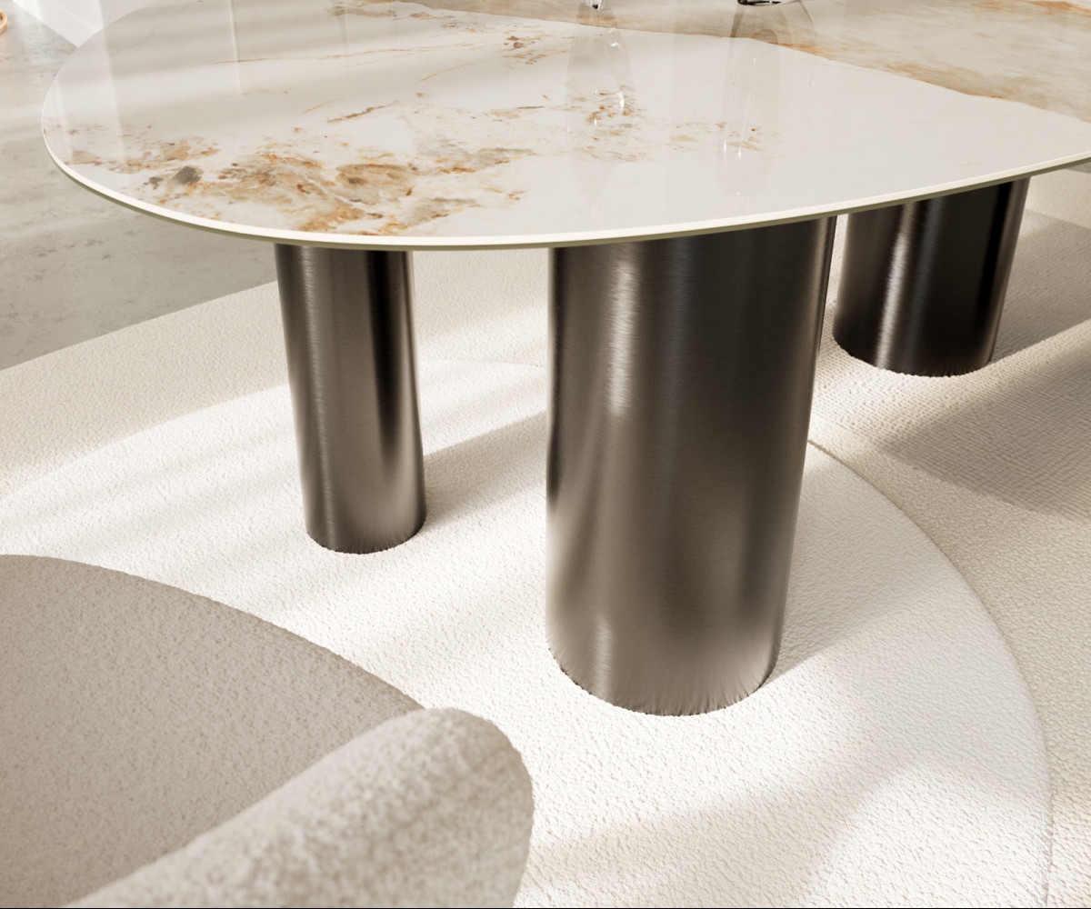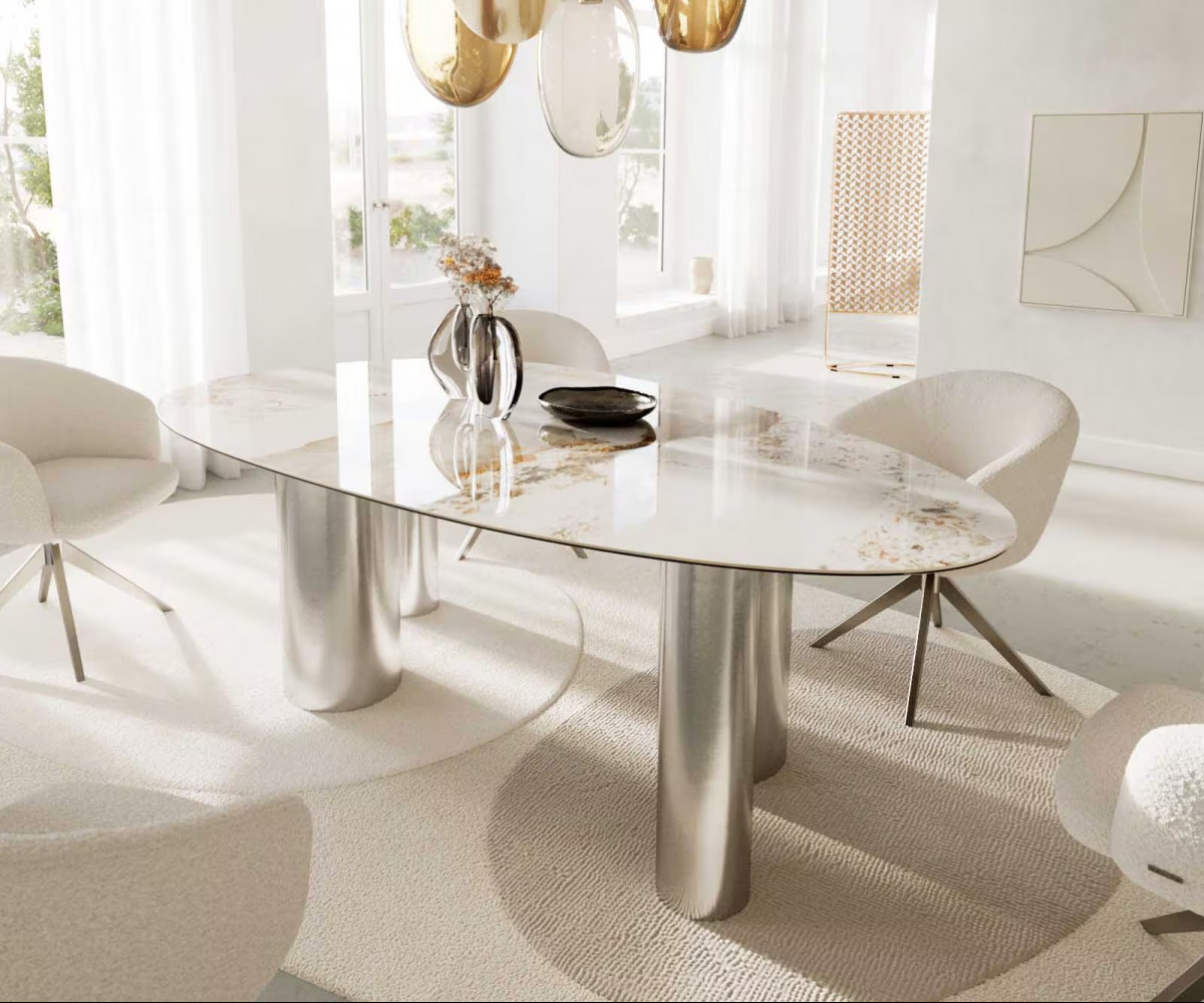 A VERANO étkezőasztal egy valódi kortárs műremek. Az ovális kerámia asztallapban örvénylő pasztell színek varázslatos látványt nyújtanak, az asztal textúrája lágyan simogatja érzékeit. A magas minőségű kerámialap biztonsági üveg hordozórétegen foglal helyet, a nagy ellenállóképességű asztallap folt és karcálló, könnyen ápolható. Az egyedien elrendezett fém lábak minimalista megjelenése rendkívül nagy stabilitással párosul. Páratlan dísze lehet egy kifinomult étkezőnek.
